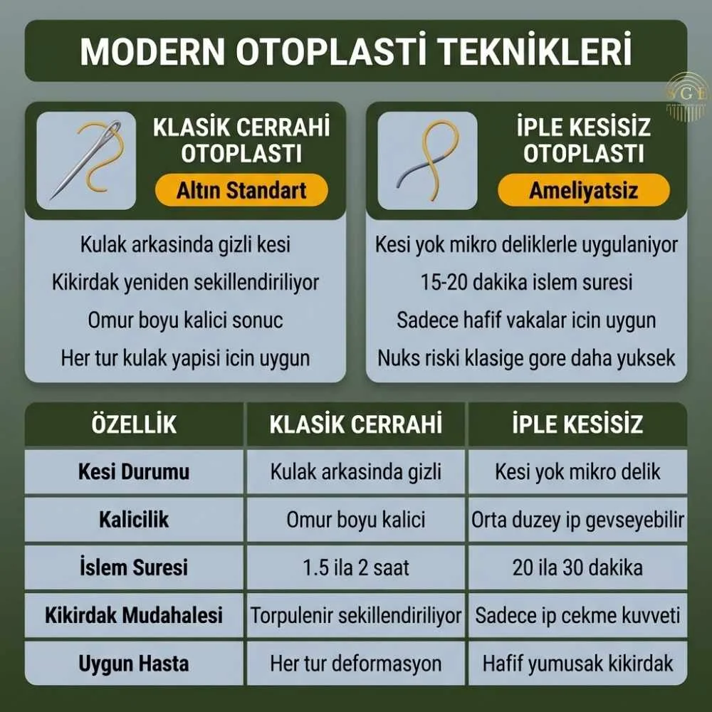 | Uygun Hasta Tipi | Her türlü kulak yapısı, asimetri ve deformasyon | Sadece kıkırdağı çok ince/yumuşak, hafif vakalar |